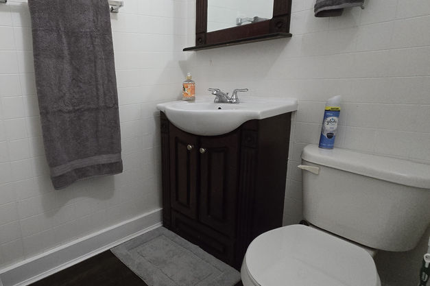The large bedroom has a great ceiling fan and is openly connected to the living room and kitchen area. The full bathroom has been remodeled.