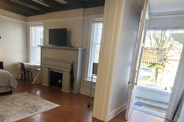This studio is unique. It has a large Living room /bedroom with 2 large windows proving great day light. It has a fireplace, a relaxing bed and high ceilings with a ceiling fan.
